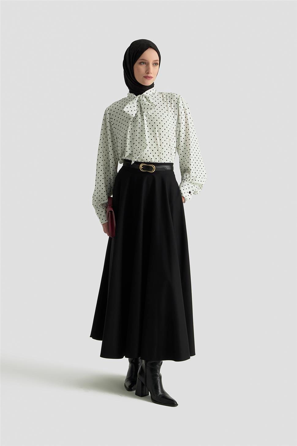 Zarif ve akıcı siluetiyle öne çıkan bu etek, belden aşağı dökümlü formu sayesinde feminen ve sofistike bir duruş sunar. Rahat kalıbı gün boyu konfor sağlarken, modern tasarımı farklı kombinlerde şıklığınızı tamamlar. Günlük şehir stilinden özel davetlere kadar geniş bir kullanım alanı sunan bu parça, gardırobunuzun zamansız favorilerinden biri olacak.