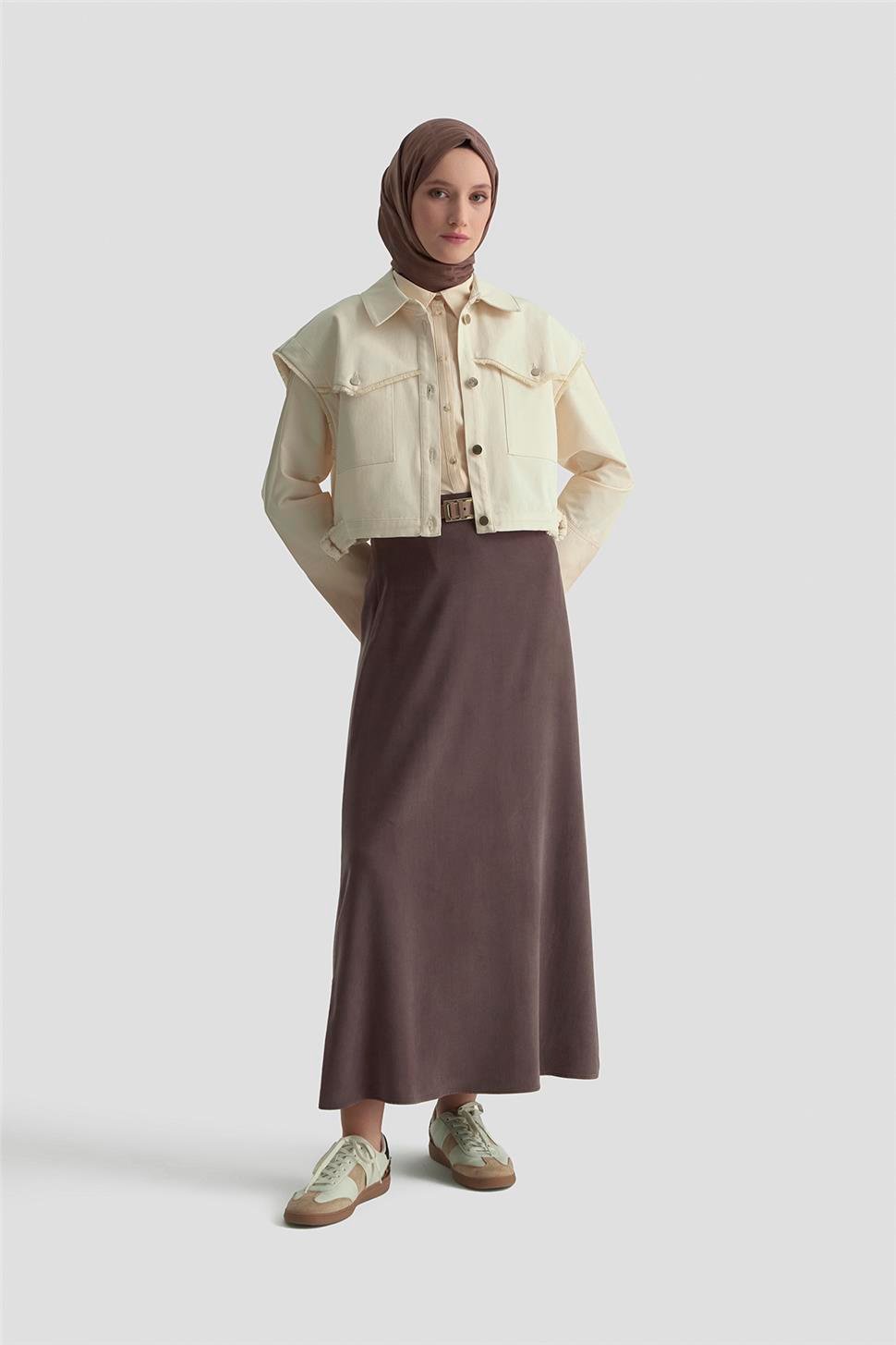 Minimal çizgilerle tasarlanan bu etek, liyosel kumaşıyla hafiflik ve konforu bir araya getiriyor. Mat ve yumuşak dokusu, şehirli stile sade ama etkileyici bir yorum katarken, belden oturan formu silueti zarifçe vurguluyor.Günlük kombinlerden hafta sonu stiline kadar geniş bir kullanım sunan bu parça, zamansız şıklığın temsilcisi.