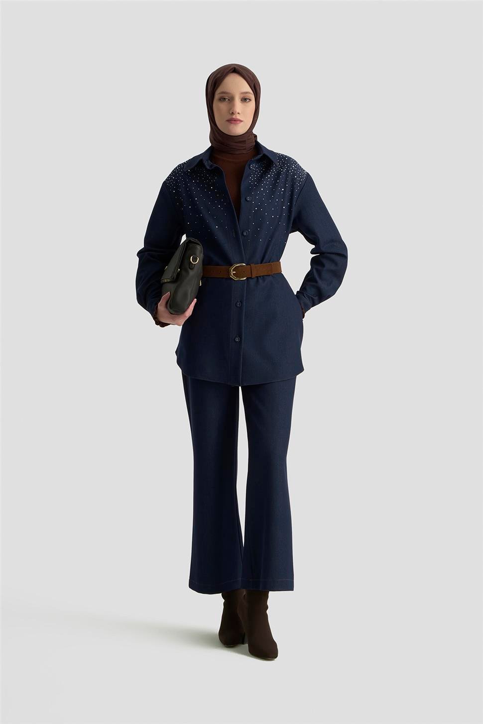 Günlük stile sofistike bir dokunuş katan bu denim takım, modern kesimi ve rahat kalıbıyla öne çıkıyor. Üst parçada yer alan taş detayları, sade görünümü ışıltılı bir zarafetle buluştururken; klasik denim dokusu zamansız bir şıklık sunuyor. Hem şehir hayatında hem de özel davetlerde kullanabileceğiniz bu takım, güçlü ve özgün bir stil için gardırobunuzun en dikkat çekici parçalarından biri olacak.